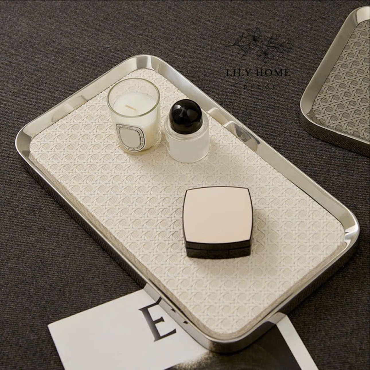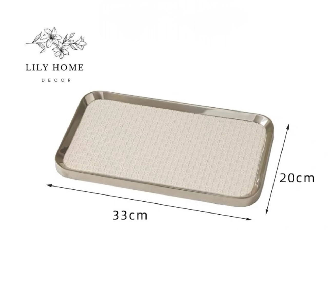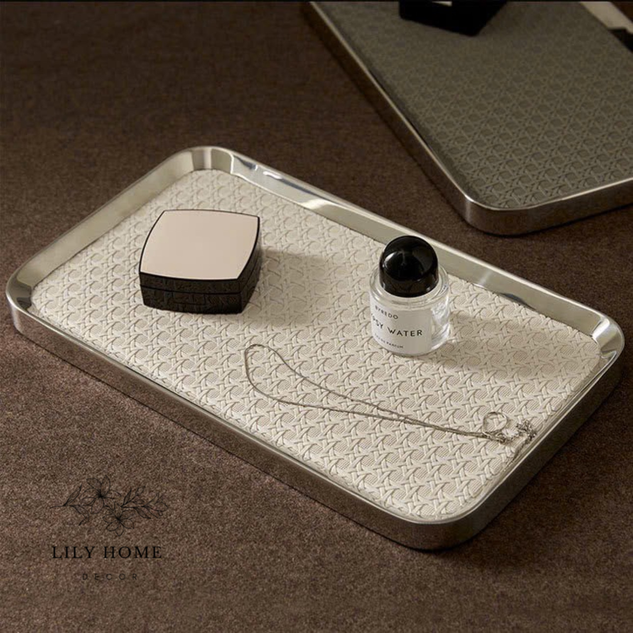 Chiếc khay được chế tác tinh xảo từ sự kết hợp giữa khung thép không gỉ sáng bóng và lớp lót da cao cấp với hoa văn dập nổi sang trọng. Phần viền thép được bo tròn mềm mại, không chỉ đảm bảo an toàn khi sử dụng mà còn tôn lên vẻ hiện đại, cao cấp.