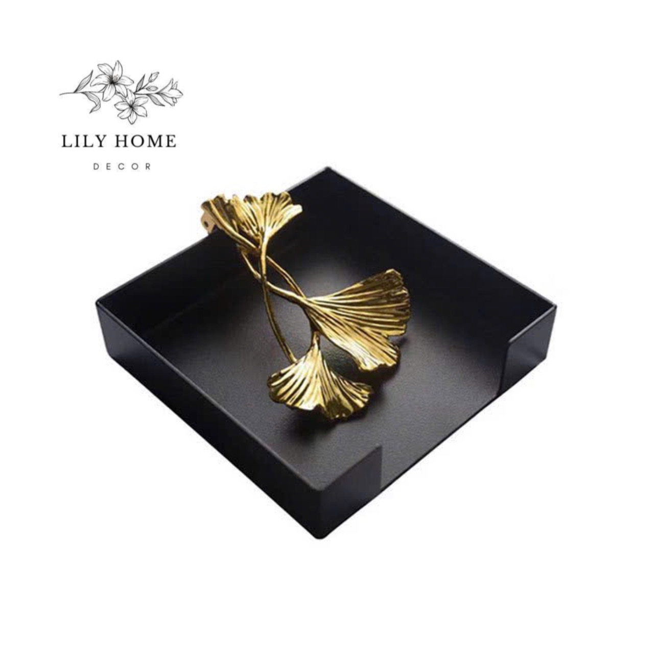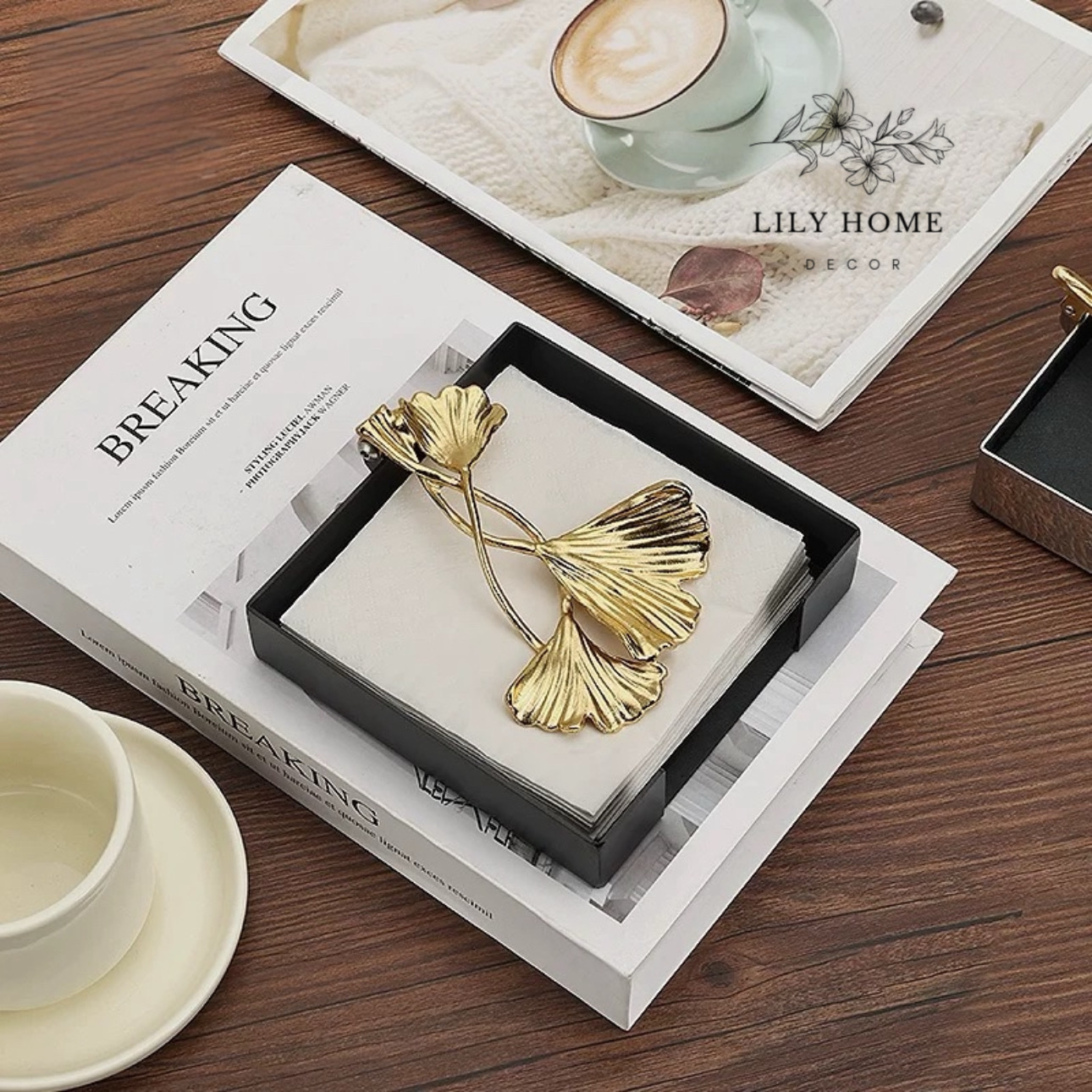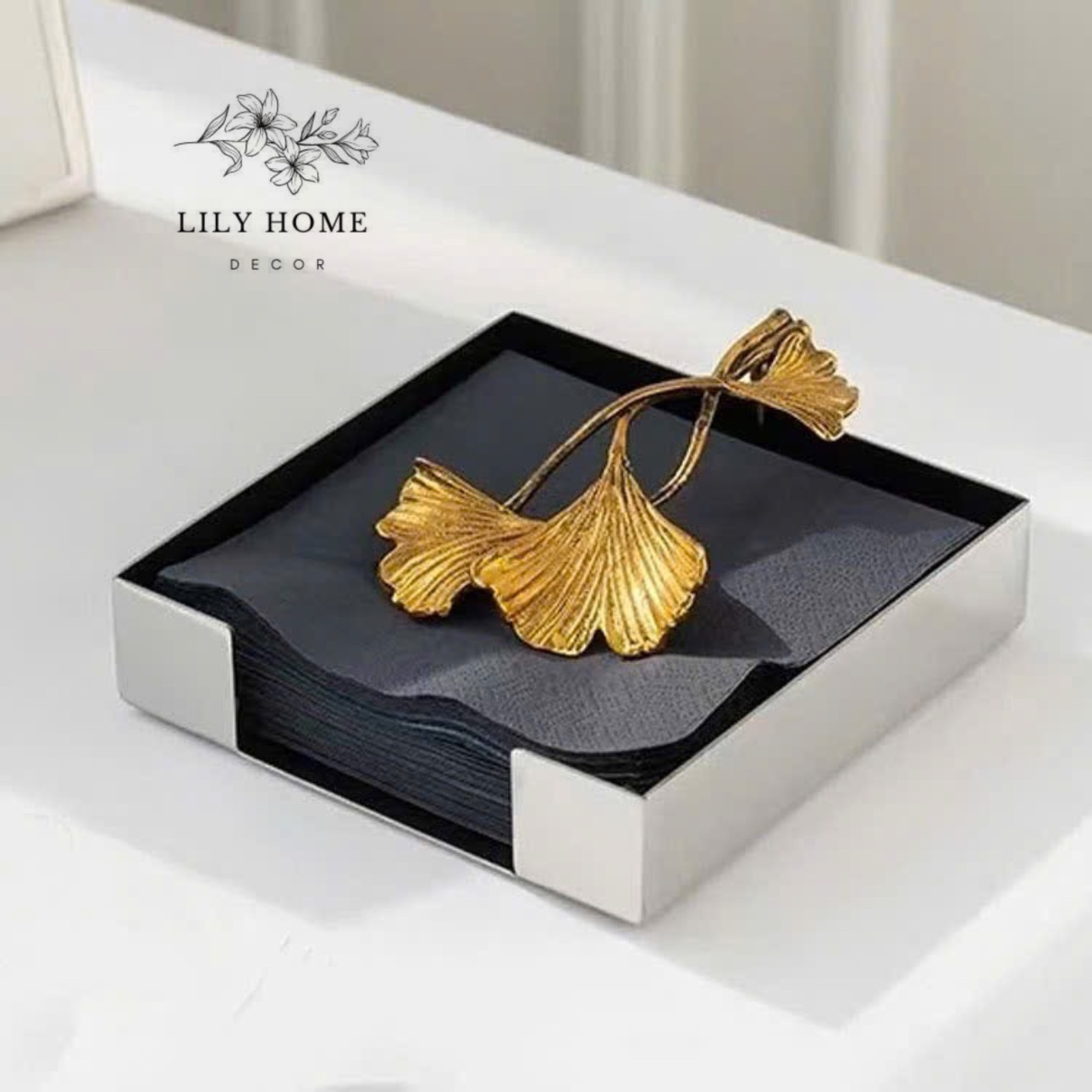 Lấy cảm hứng từ lá Ngân Hạnh – biểu tượng của sự trường tồn và may mắn, phần chặn giấy được tạo hình sống động, mạ ánh vàng sang trọng, vừa giữ khăn giấy cố định vừa như một món phụ kiện trang trí đắt giá. Hộp được chế tác theo phong cách sang trọng, nhẹ nhàng, tối giản về đường nét nhưng tinh xảo ở từng chi tiết.