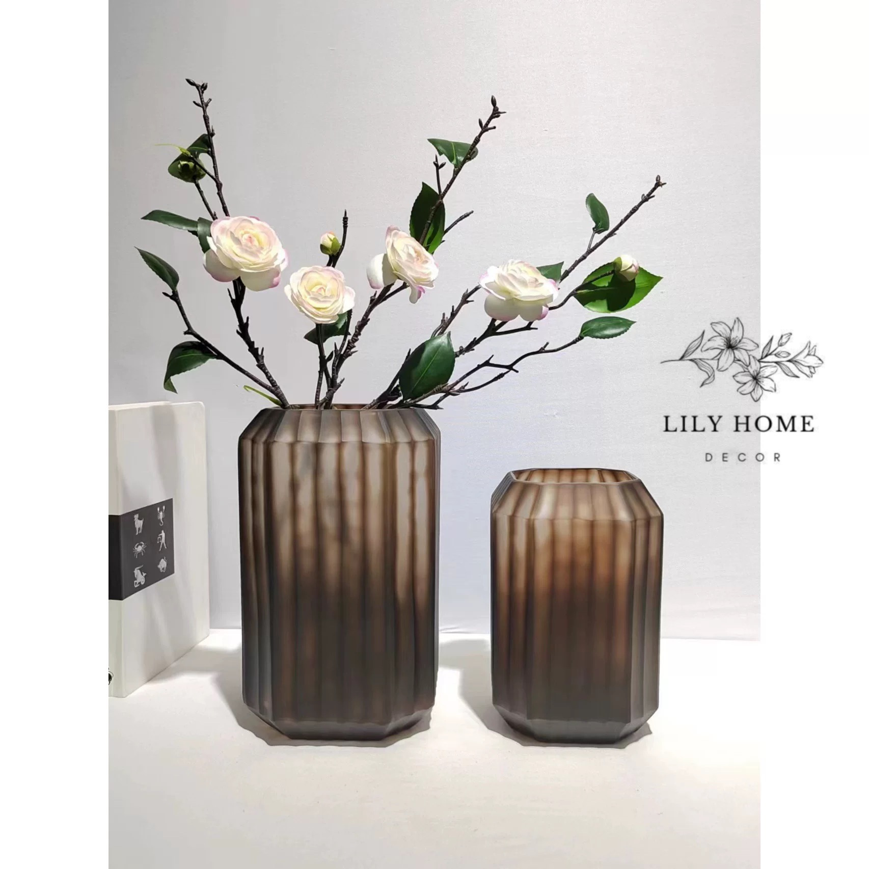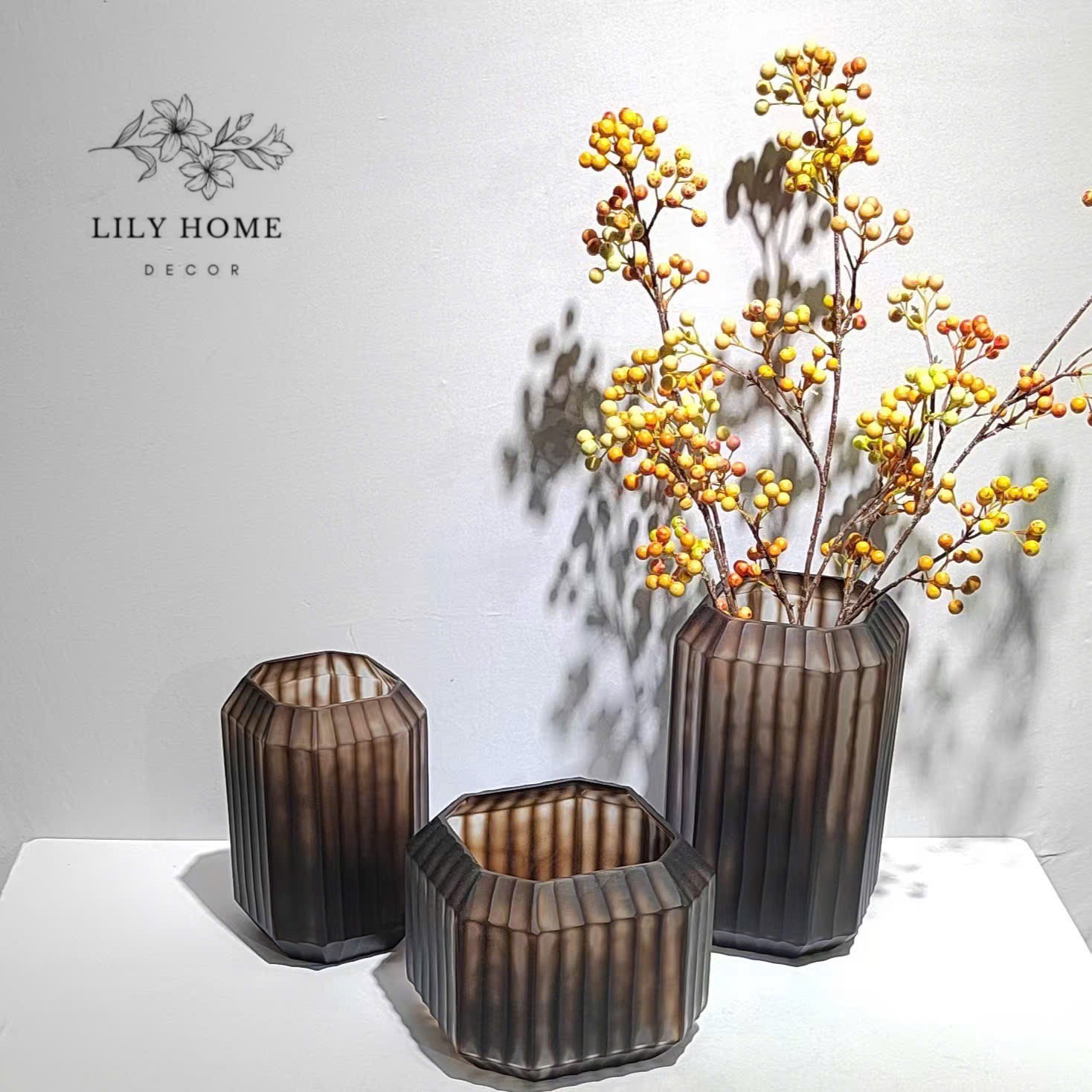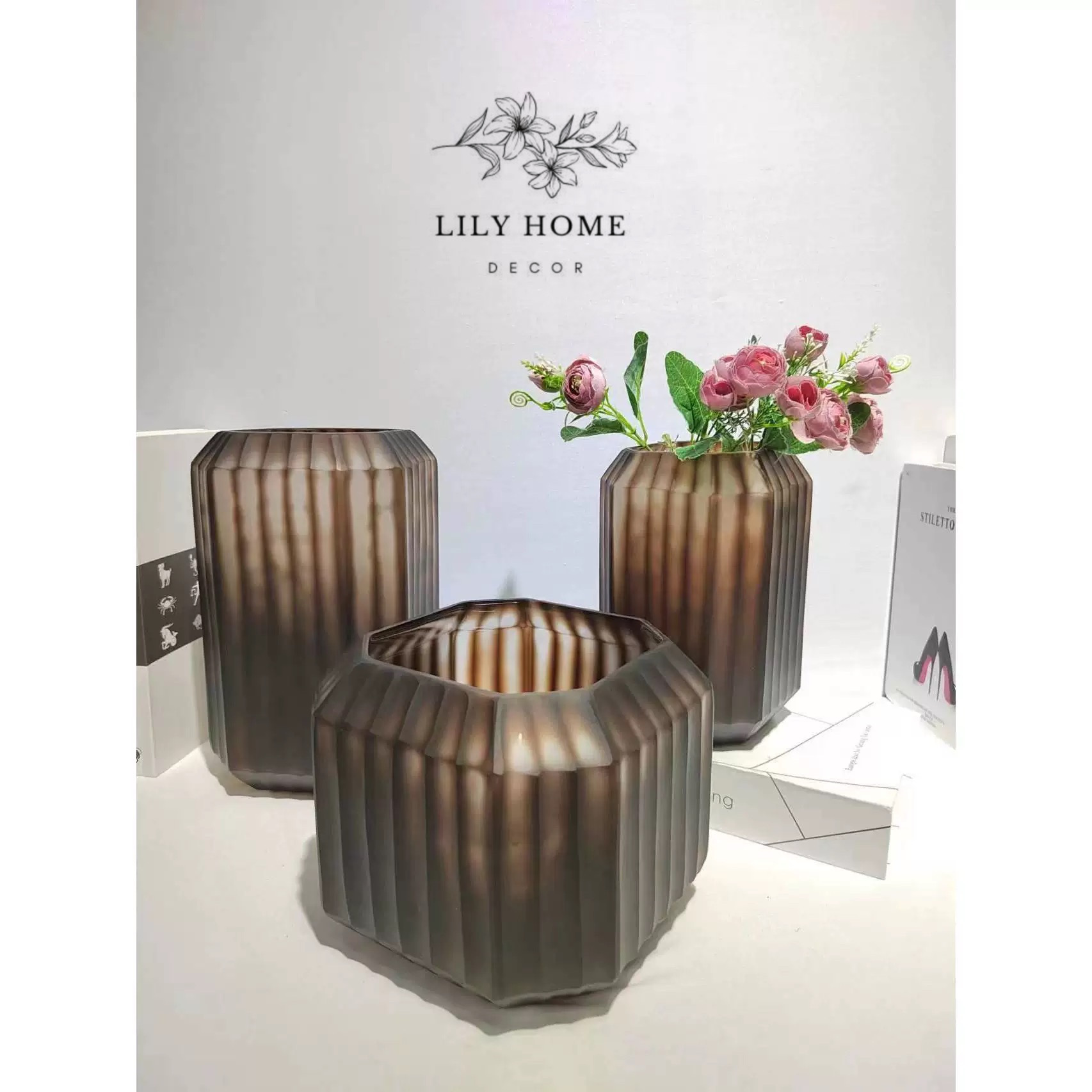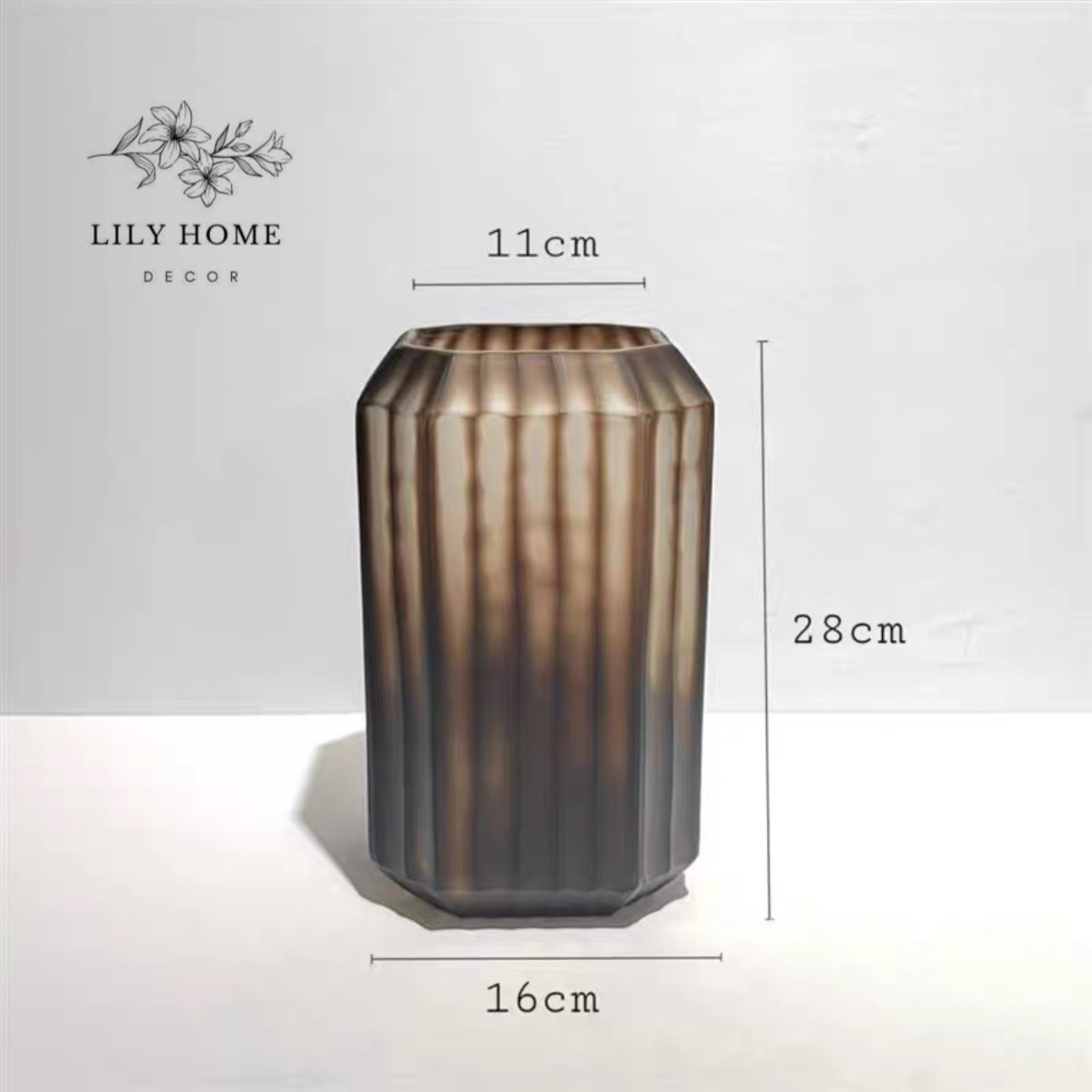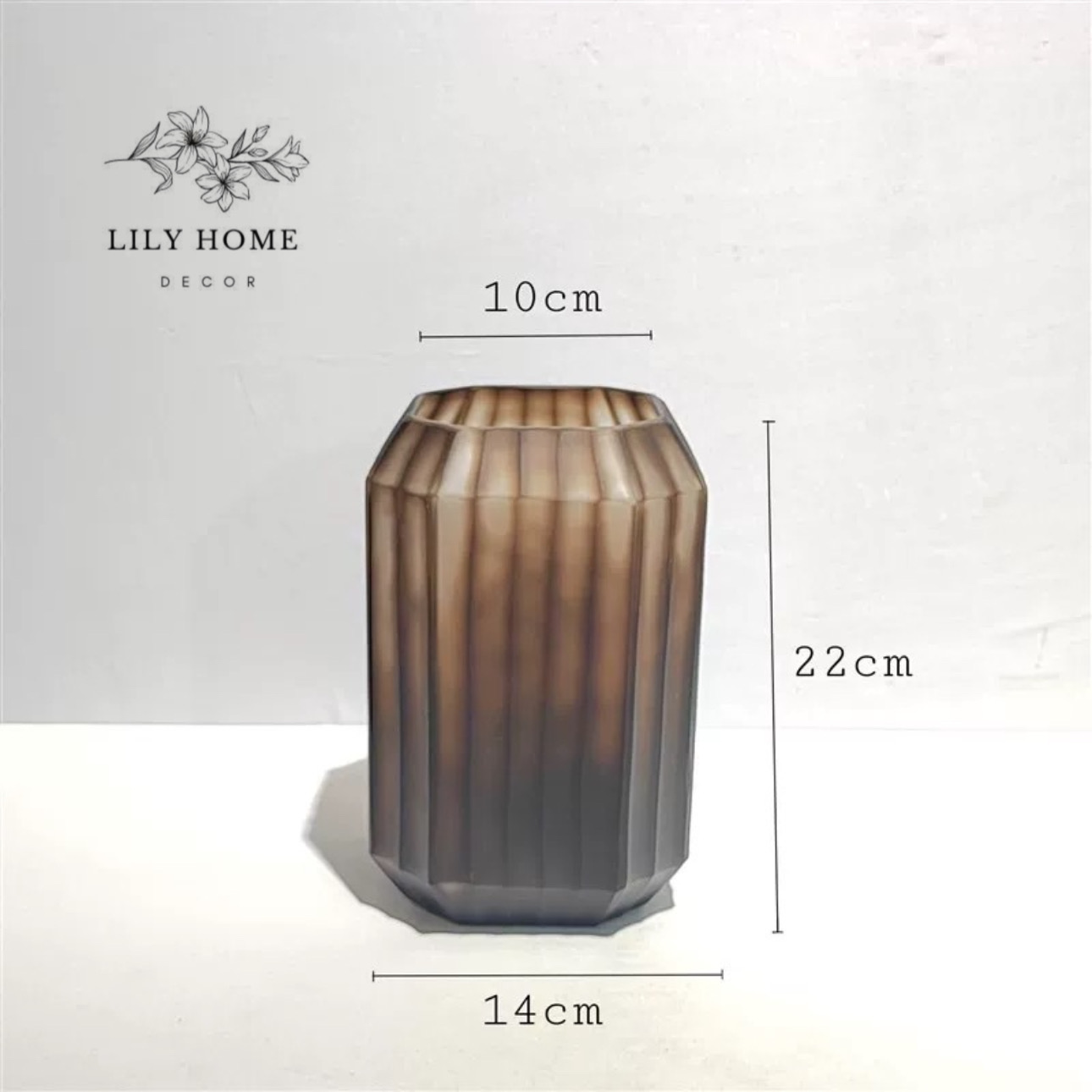 Bình được thiết kế với hình khối lục giác/đa giác bo góc mềm mại, tạo nên sự cân đối, chắc chắn và rất hợp xu hướng decor nội thất hiện đại. Các đường gân sọc dọc được dập nổi đều đặn quanh thân bình, khi ánh sáng chiếu vào sẽ tạo hiệu ứng thị giác bắt mắt, mang lại cảm giác sang trọng, huyền ảo như những nếp gấp vải cao cấp. Lớp phủ thủy tinh màu khói nâu (smoky brown) vừa cổ điển vừa thời thượng. Sắc độ trong – mờ xen kẽ tạo chiều sâu và sự khác biệt, dễ dàng hòa hợp với nhiều phong cách nội thất từ hiện đại, tối giản đến tân cổ điển.